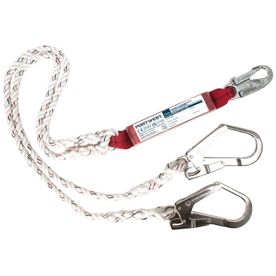 The double end lanyard has two 120cm ropes with a tear open energy absorber, two scaffold hooks and one snap hook. 180cm in total including scaffold hooks and snap hook.