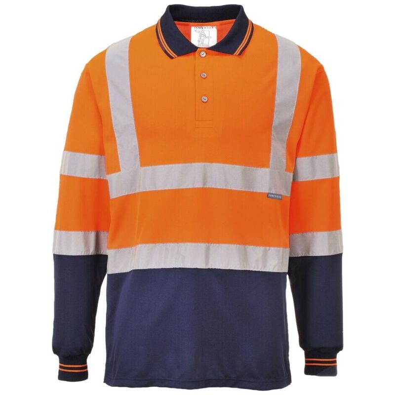 This style combines all the benefits of our best selling long sleeve polo with the additional feature of two-toning for even more practical benefit. The polyester bird eye knit material used is breathable, light, and comfortable.