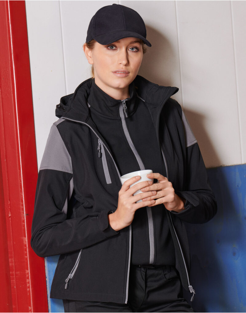 - Bicolour softshell jacket with detachable hood.