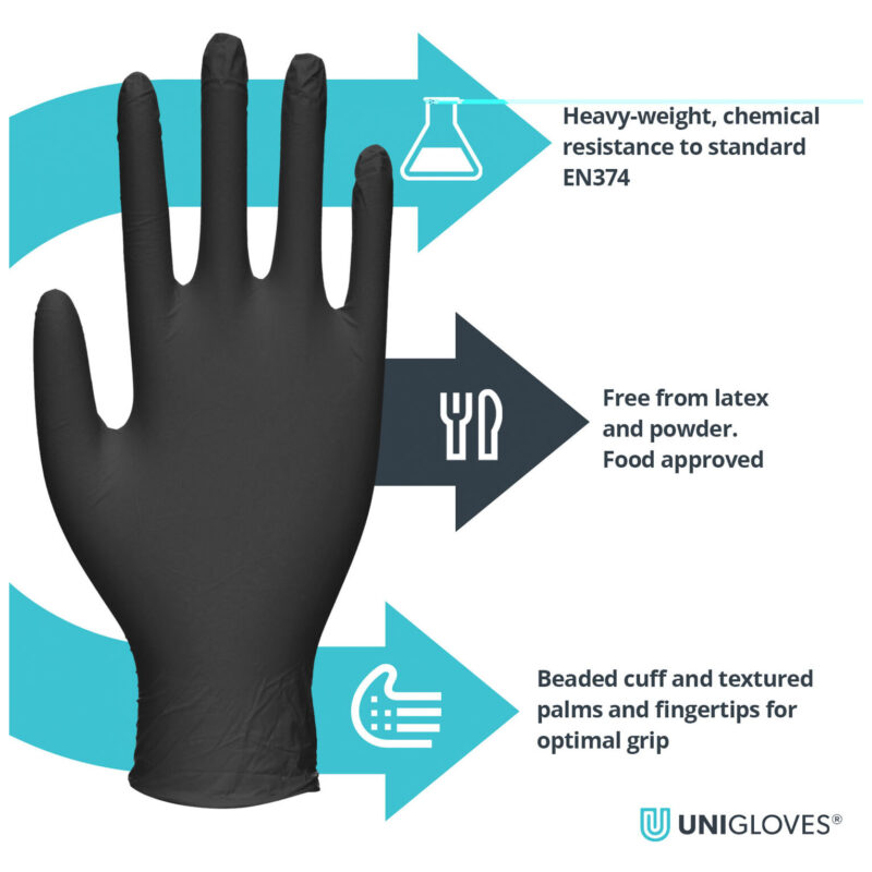 Enhanced chemical splash protection, silicone free, black, heavy duty nitrile examination gloves made with a unique Unigloves formulation for a softer, more comfortable finish.