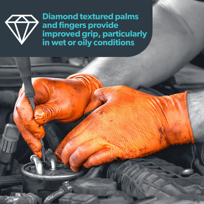 Silicone free, diamond textured, chemical tested, orange, ultra heavy weight disposable nitrile gloves. Unigloves PRO.TECT heavy and ultra heavy-duty gloves; the UK’s leading automotive glove range.
