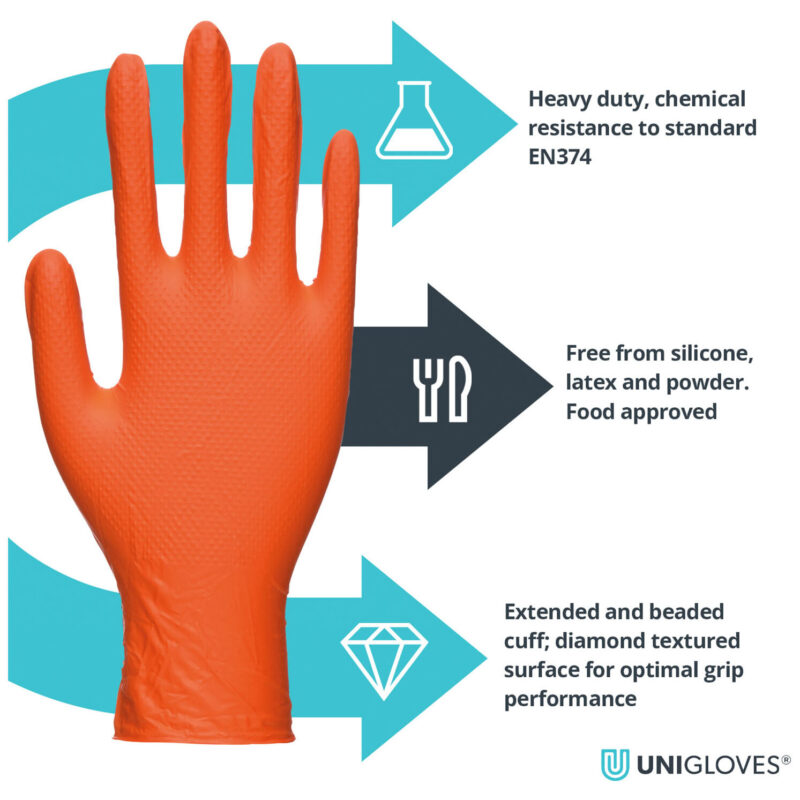 Unigloves PRO.TECT Orange HD - Diamond Grip - Heavy Duty Disposable Nitrile Gloves - Powder Free