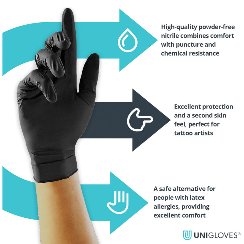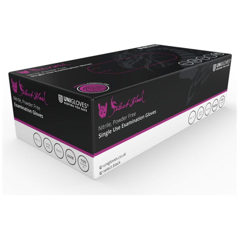 The Select Black Powder Free Nitrile Single-Use Gloves Are Ideal for Tattooing and piercing, with a beaded edge to aid in wearing, smooth finish for cleaning and hygiene and enhanced fingertip grip.