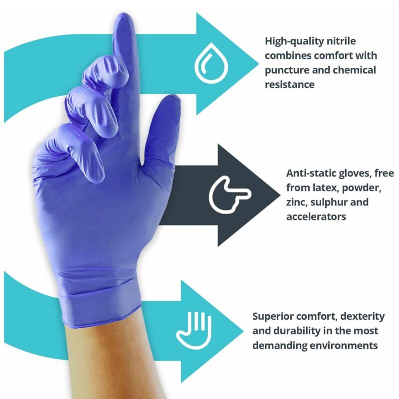 These medical grade gloves are made from zinc free, sulphur free and accelerator free nitrile, which is a non-latex material that conforms to the hand, giving a more comfortable fit for easy use